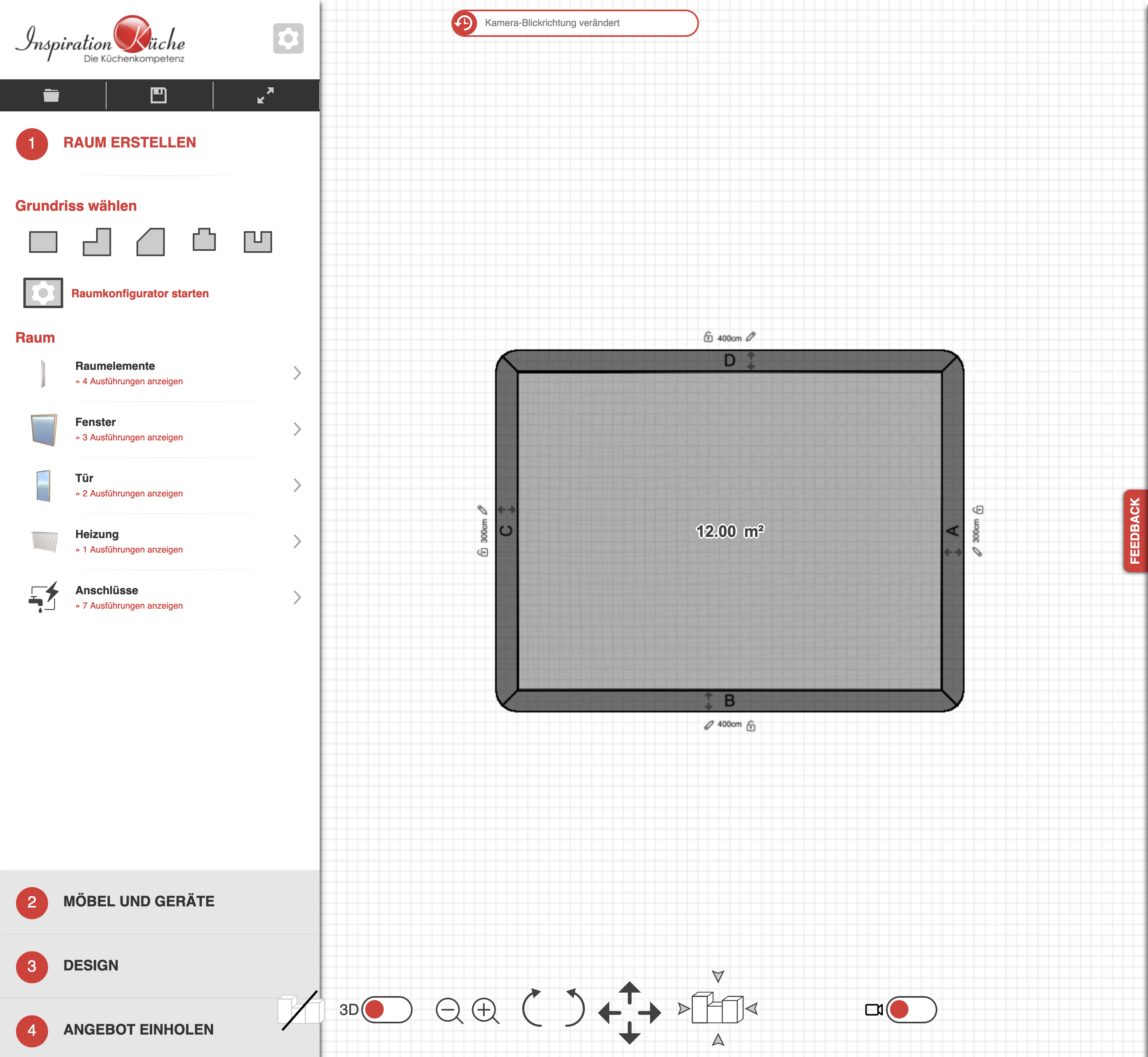 Planen Sie den Raum, positionieren Sie Fenster und wählen Sie Möbel aus, um Ihre ideale Küche zu kreieren.